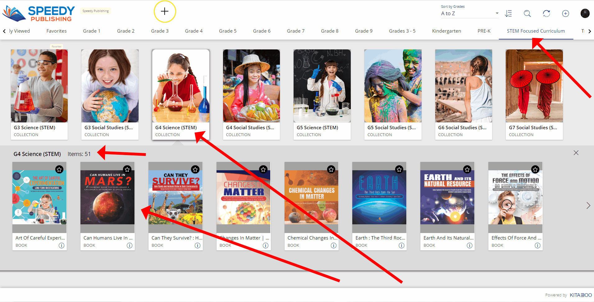 After selecting the GRADE you can select the COLLECTION and the BOOKS that are in these COLLECTIONS. In this Example we selected Grade 4 Science STEM Focused, in this collection there are 51 titles and the book in focus is "Can Humans Live On Mars".